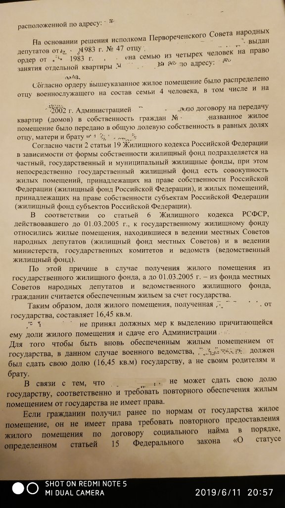 #7573Отцу в 1980г от горисполкома дали квартиру на 4 человек (отец, мать, дочь, сын). В 85 родился еще сын. Я средний сын. В 90-х сестра выписалась из квартиры и участвовала в приватизации др квартиры. В 99 я поступил на службу. В 2001 покупаю себе 2-х комнатную квартиру, уже приватизированную. Следом отец приватизирует свою квартиру на трех собственников (отец, мать, и младшего сына). В 2016 с рождением второго ребенка стало не хватать квадратов. Подал в ЖК документы на доп. жилплощадь, получил отказ.