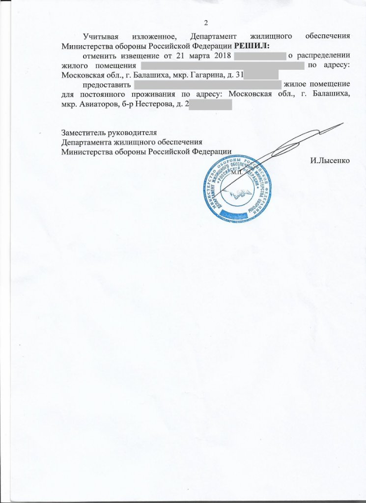 #610На д.31 мкр. Гагарина оформлено право собственности в 2016 г. и он введен в эксплуатацию в ноябре 2017 г. Такой формы нормативно-правового документа как Решение об отмене извещения.... нет ни в одном приказе Минобороны, не говоря об Постановления Правительства и ФЗ. Это самодеятельность ДЖО, тем более с ложной информацией, касающейся права собственности РФ. В понедельник 10.06.19 управление ЖКХ администрации г.о. Балашихи должно разместить на сайте подписанный сегодня УК Комфорт-Сервис договор на управление МКД. В течении последующих 10 дней, УК должна подписать договор хотя бы с одним собственником, представить этот договор в Жил. инспекцию и она должна будет появиться в реестре УК. Именно после этого появляются правовые основания по заселению данного дома.