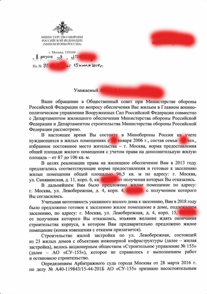 #53868Суды, как оказалось, совсем не намерены вставать на сторону закона, а заодно и граждан. Я в данное время пытаюсь узнать лично от министра то, чем он занимался с 2014 года - даты вручения мне предварительного извещения на 23 корпус. В рамках переписки это выяснить не удалось. В суде заставить ответить и предоставить информацию оказалось делом непростым. Ввиду того, что первая инстанция в лице судьи гарнизонного военного суда решила, что на обращения офицера министр может и не отвечать. В сентябре Апелляция. И это только первый этап - попытка выяснить причины бездействия министра. Далее я планирую привлечь Шойгу к юридической ответственности за противоправное бездействие, причинившее вред моему конституционному праву на жильё.Это сайт правовой взаимопомощи нам с вами. Если есть доказательства всех тех нарушений, что вы перечислили, то в суд подавайте на МО РФ, Шойгу и т.д. Вы как-будто из сказки вышли и сразу на Левобережную (Люциферную), где всё так гадко и отвратно. Насильно же никто этот адрес не вручал? Все, кто на форуме ждёт эти квартиры, прекрасно знают, что их ждёт, и взвешивают "за" и "против". Очень многие уже ездят на работу и дети в школах.QR_BBPOST И что делать?