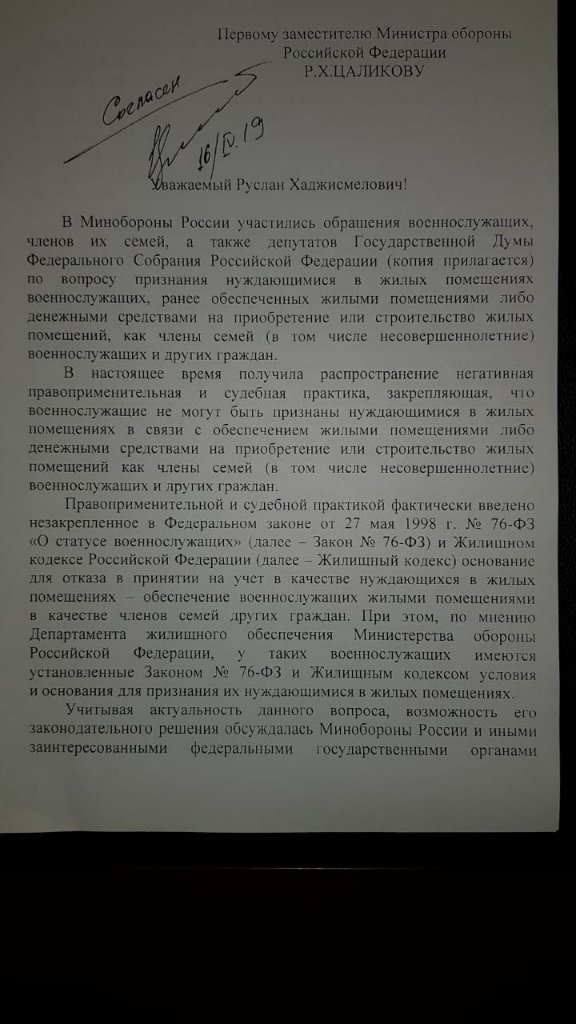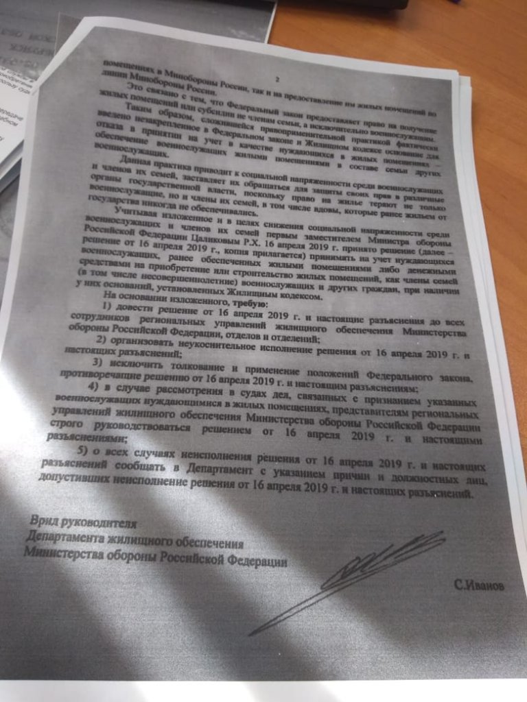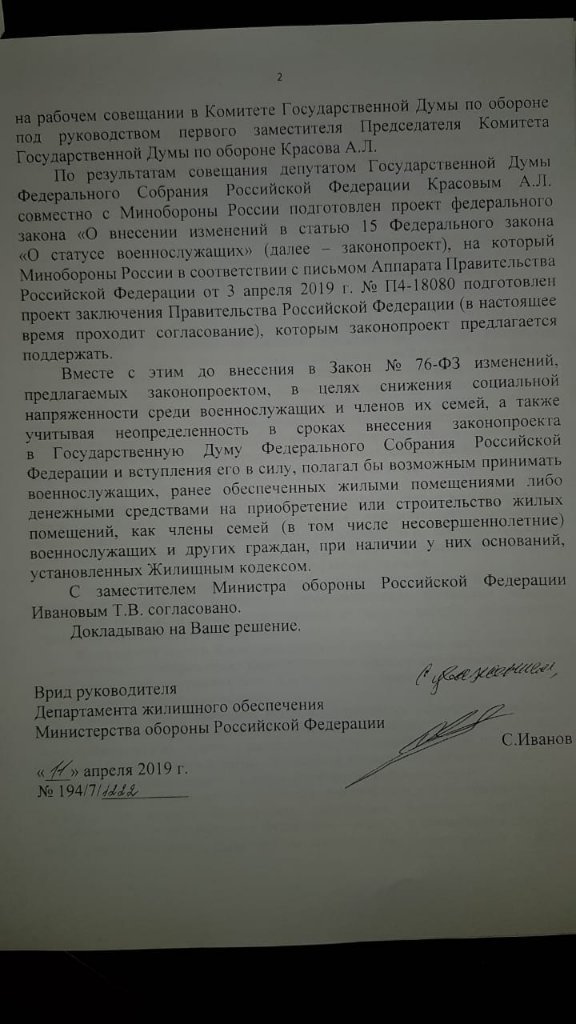 #51651Разъяснения от руководителя Джо от апреля 19 года, на основании письма первого заместителя министра обороны (касаемо обеспечения жильём военнослужащих, которые ранее были обеспечены родителями - грубо говоря)Добрый день. О каком документе идет речь?Ничего себе! Да это один из самых классных документов, он решает почти все вопросы на обсуждаемую тему. Ну только если не учитывает жён военнослужащих в подобной ситуации. Знал бы этот документ - не было бы вопросов. Спасибо за инфуА отказ писал?