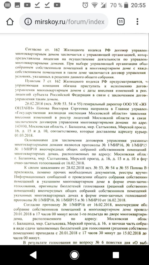 #7145Добрый день. В наш дом в Нахабино, Инженерная,4/1 и 4/2 "пришла" УК ЖКХ-ОНЛАЙН. Скорее, вломилась. До этого у нас была ГУЖФ. За май квитанции пришли от обеих УК сразу, естественно, нас сильно волнует кто из них на законных основаниях. В ЖКХ-ОНЛАЙН нам показали копии протокола ОСС и Договора управления. Причём собрание якобы проводилось аж в декабре 2017. Нас никто ни о каком собрании не уведомлял, результаты никто не доводил, про новую УК мы узнали из платёжек в почтовых ящиках. На сайте ГЖИ 1-ый корпус с марта под управлением ЖКХ-ОНЛАЙН, 2-ой так и остался под ГУЖФ. Никакой передачи домов из ГУЖФ в ЖКХ-ОНЛАЙН не было. Более 50% квартир в наших домах в государственной федеральной собственности, право оперативного управления у ФГКУ "СТУИО"(соответственно и право голоса на собраниях). Протокол ОСС и Договор управления с ЖКХ-ОНЛАЙН, как и ваш, подписаны Мосуновым, доверенность выдана ему командующим ЗВО Картаполовым. В силу не знания структуры департаментов и управлений МО у меня возник вопрос: командующий ЗВО имеет право "осуществлять действия по управлению жилфондом" и передоверять их? Почему не из СТУИО доверенность? Может мне кто-нибудь объяснить?