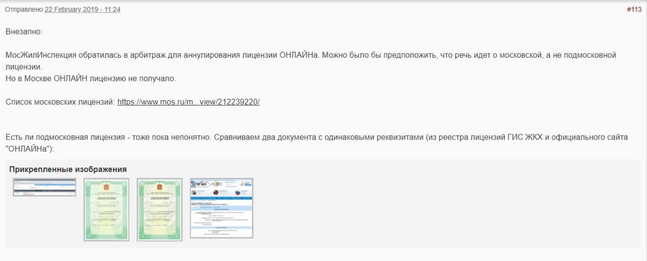 #7163Добрый день. Мы в Нахабино с ОНЛАЙН-ом в прошлом году воевали. Вчера почитала ваш форум (mirskoy...). Поскольку там писать не могу, напишу тут, возможно, вам пригодится информация. У вас возникал вопрос по поводу подмосковной лицензии ОНЛАЙНа. Если смотреть на оборотную сторону лицензий, то там номера бланков и подписанты разные. И ещё, совсем недавно в реестр лицензий внесли приказ о переоформлении лицензии. Только приказ от июля 2017, а внесли в реестр его в марте 2019.
