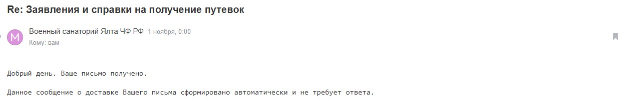 Отправляла документы на электронную почту zayavka_sku@mil.ru 4 ноября. 5 ноября пришло письмо, о том, что моя заявка направлена на рассмотрение в санаторно-курортную организацию, указанную в «Теме» электронного письма (Паратунку).