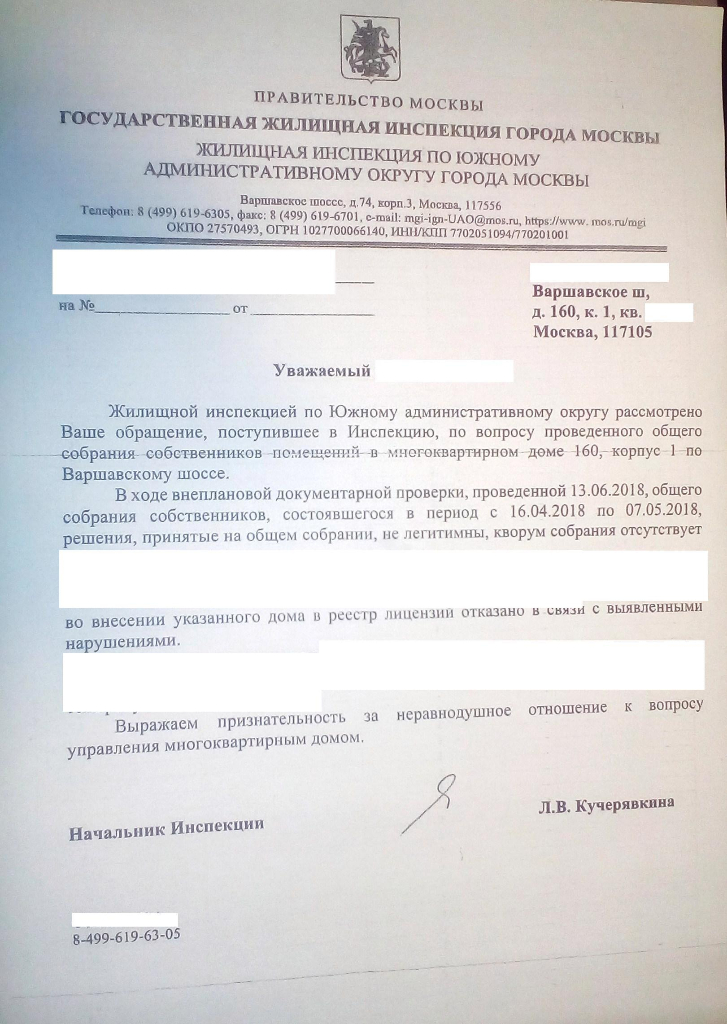 Как сообщалось ранее, дата повторного рассмотрения Чертановским районным судом частной жалобы ООО «ПИК-Комфорт» по состоянию на 11.02.2020 не назначена. В связи с тем, что собственниками принятое решение о выборе управляющей организации не реализовано, управой района Чертаново Южное 30.10.2019 проведен открытый конкурс, в результате которого выбрана организация ООО «Спрут». Организация ООО «Спрут» приступила к управлению домом. Справочно сообщаем, что в Мосжилинспекцию поступило заявление о включении в реестр лицензий города Москвы указанного дома, ориентировочный срок внесения дома 21.02.2020. Вопрос на контроле Инспекции до 06.03.2020.