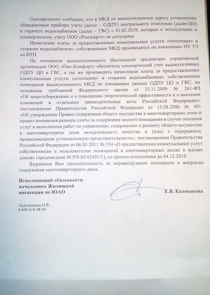 5. Обязать ООО "ПИК-Комфорт" в разумный срок поставить общедомовой прибор учета тепловой энергии, установленный по адресу: г. Москва, Варшавское ш., д. 160, корп. 1 на коммерческий учет, в разумный срок предоставить истцу надлежаще заверенные копии документов о постановке прибора на коммерческий учет и о закон-ности дальнейшего применения его показаний при расчетах с потребителями за ока-занную услугу по отоплению.