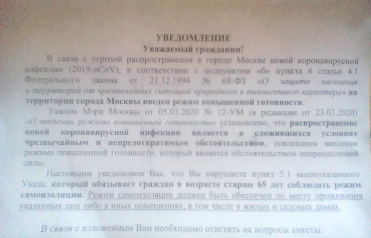 Выходил в магазин за продуктами и товарами первой необходимости, правда мне 65 лет нет, но документов при себе не было, видимо полицейский счел нужным уведомить..., но выдают уведомления всем подряд…на возраст не смотрят. Один гражданин хотел убежать, но поймали, и смех и грех как говориться…