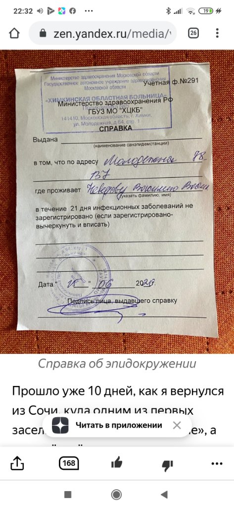 #13249Кто выдал справку?Именно об отсутствии контактов с ковидными больными в поликлинике отказываются дать, т.к. реально не знают кто с кем контактировал и не хотят брать на себя ответственность. Дают только справку о том, что инфекций по адресу проживания не зарегистрировано. В детской поликлинике аналогичная ситуация. Где ее брать?QR_BBPOST отдыхающим по-прежнему нужно предоставить справку о том, что они не контактировали с зараженными коронавирусом в течение последних 14 дней. Документ должен быть выдан медицинской организацией не позднее, чем за три дня до даты отъезда