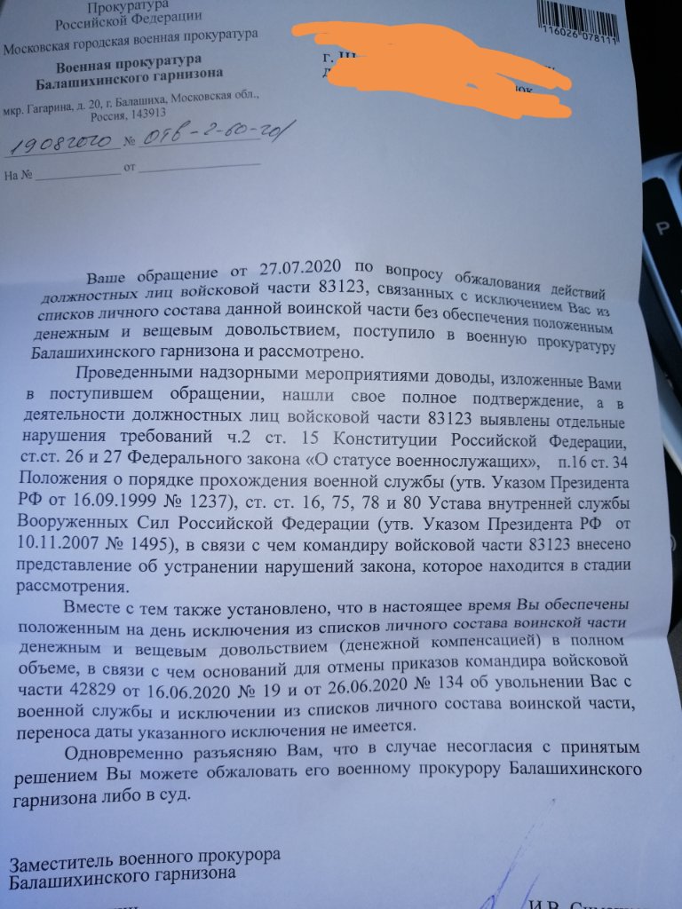 Сегодня пришёл ответ из прокуратуруы. Тоже не состыковки если приказ об исключении от 26.06, а дд за июнь я обеспечен по 18.06.