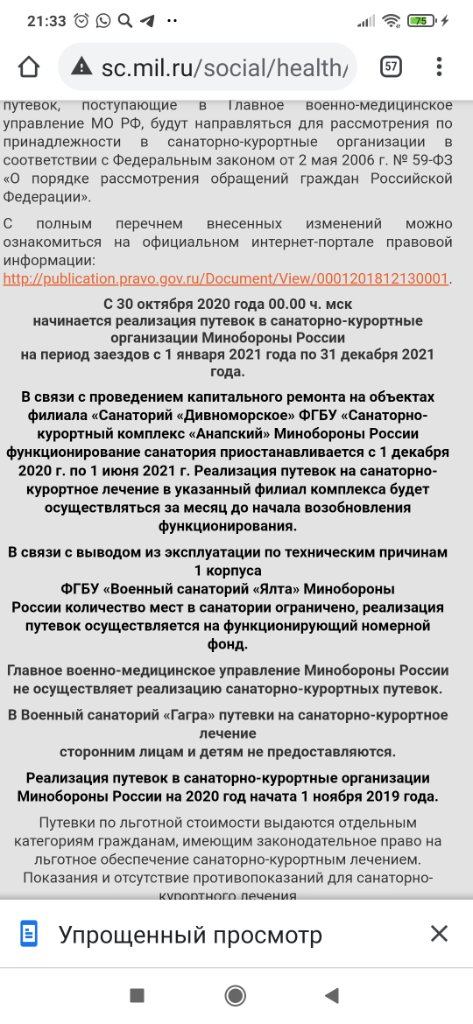01.11.2019 в 15.43 был получен отказ (№ письма 6275 от внимание 31.10.2019!!) за подписью Начальника ФГБУ Военный санаторий КРЫМ В.Клемешева с следующим текстом: согласно раздела III п.12 Порядка сан-кур.обеспечения в ВС РФ разрабатывается и утверждается план распределения сан-кур путевок на следующий год.До получения плана распределение не производится. Ваше заявление рассмотрено без реализации. Видимо заявление рассматривалось в ночи, а 01.11.2019 мест в санатории на 2020г. для военных пенсионеров отслуживших много лет уже нет!!!!