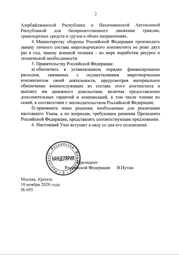 #1Указ Президента Российской Федерации от 10.11.2020 № 695 "О мерах по поддержанию мира в Нагорном Карабахе"