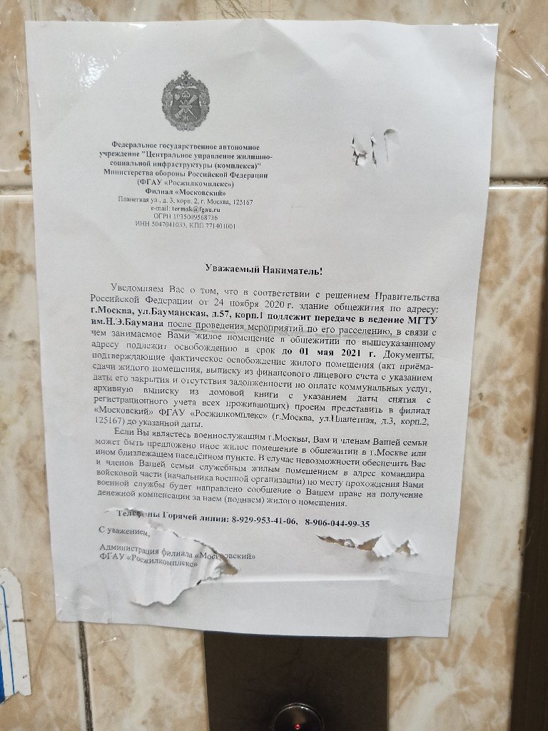 Создайте, пожалуйста здесь или в другом месте тему "Выселение из военного общежития на Бауманской д. 57 к. 1"