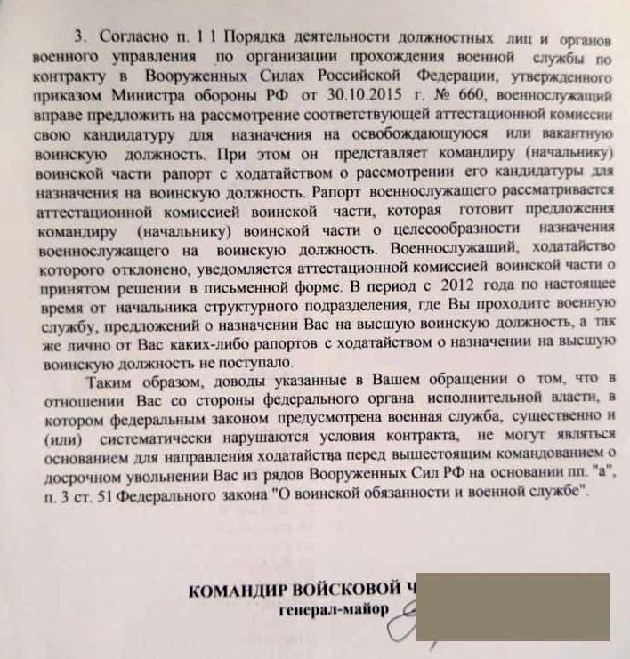 В заявлении я ПРОШУ: Обязать командира войсковой части хххххх в пределах своей компетенции принять исчерпывающие меры по увольнению майора ххххххххххххххх с военной службы в связи с существенным и (или) систематическим нарушением в отношении его условий контракта о прохождении военной службы со стороны Минобороны России (подпункт "а" пункта 3 статьи 51 Федерального закона "О воинской обязанности и военной службе").