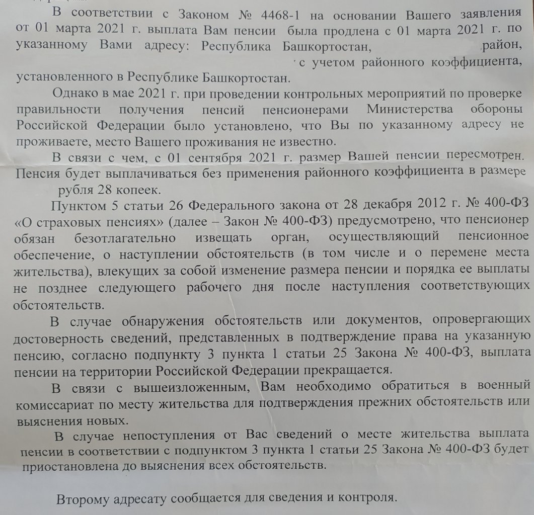 Служил в Анапе, приехал на Родину в Башкирию, прописался в родном доме, встал на учёт, получаю военную пенсию с р.к , живу по месту прописки. Как то был звонок с военкомата, а теперь пришло письмо где написано что типа проверяли живу ли я по месту прописки, определили что не живу и прекращают платить р.к. а через время и пенсию. Фактически живу там где прописан! Как определили что живу или не живу не знаю. Обязывают явиться в военкомат. Интересует насколько правомерна их проверка? На каком основании? (Законы и т.д) Как они определили что живу неживу вообще не ясно. Я же не в колонии поселения и не под домашним арестом. Документальных оснований я так и не нашел.