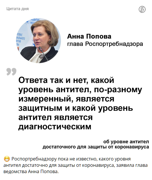 #2505Роспортребнадзору пока не известно, какого уровня антител достаточно для защиты от коронавируса, заявила глава ведомства Анна Попова.