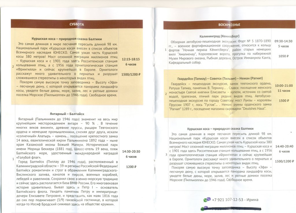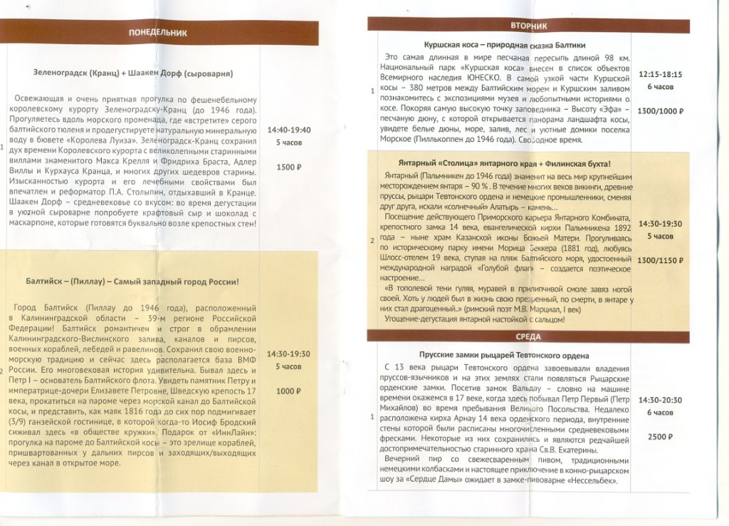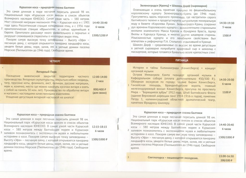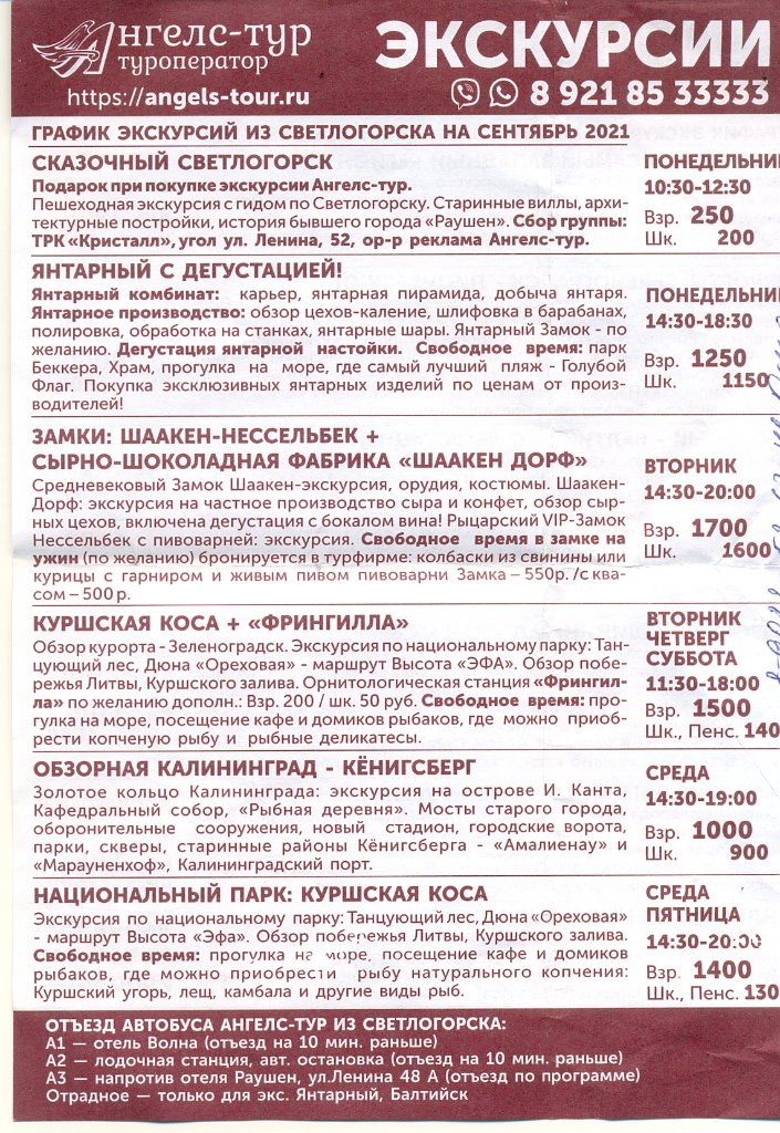 #18088В Светлогорске несколько туроператоров, которые предлагают экскурсии. Прилагаю расписание экскурсий от двух, услугами которых пользовался сам. Последние три файла не получилось вставить в читабельном виде. Попробуйте у себя на ПК перевернуть. Цены с дробью это льготные для пенсионеров, в т.ч. и военных. Информация актуальна на октябрь 2021.Ура! Сегодня пришло уведомление в Светлогорск, почти как просили с 14.07 по 03.08! Посылали только по электронке в 00.01. Может кто-нибудь дать полезную ссылку на " почитать-посмотреть" про санаторий, отзывы, фото и т.п., так как там будем впервые? Всем также желаю получить желанное "письмо счастья" - уведомление в избранное место отдыха!