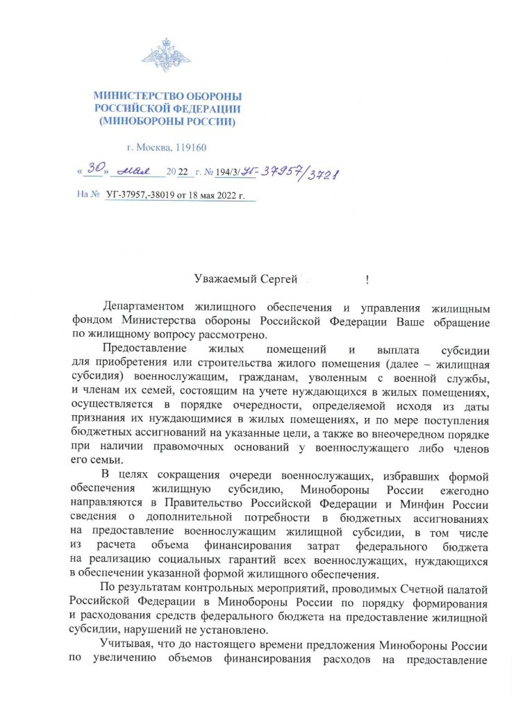 #62483Ну вот и дождался ответа от РуЖО. Напоминаю, написал обращение в администрацию Президента и в Правительство. По какой линии получен ответ - не важно. Важен сам ответ. Мин обороны обращается в Правительство, а от туда кукишь.