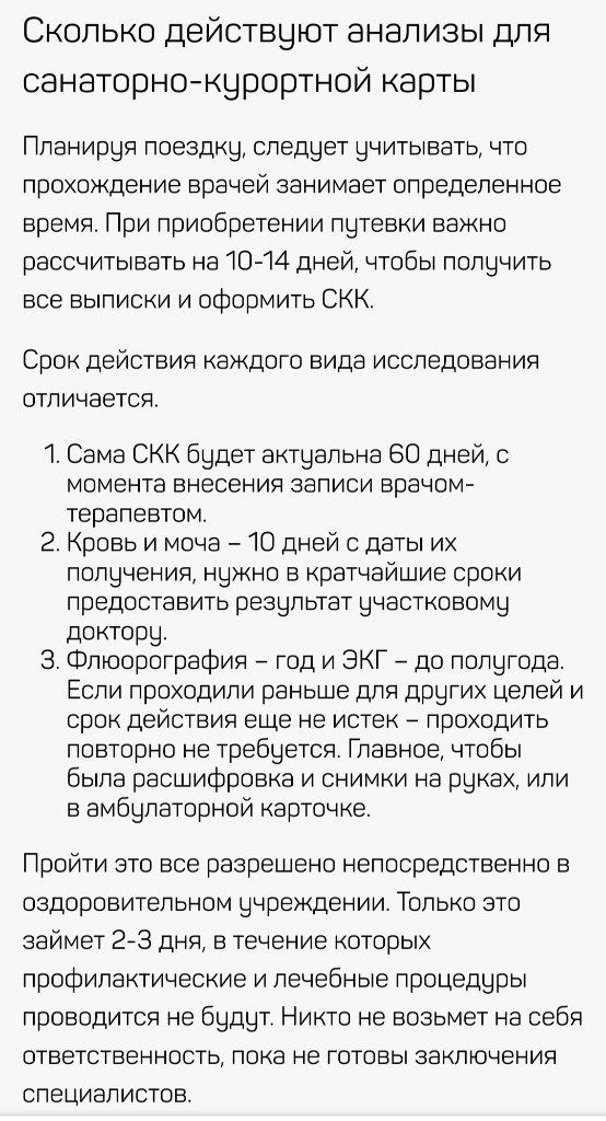 В поликлинике мне, исходя из даты заезда в санаторий и срока годности СКК (2 месяца), выдали талоны на сдачу анализов, срок годности которых - 10 дней.