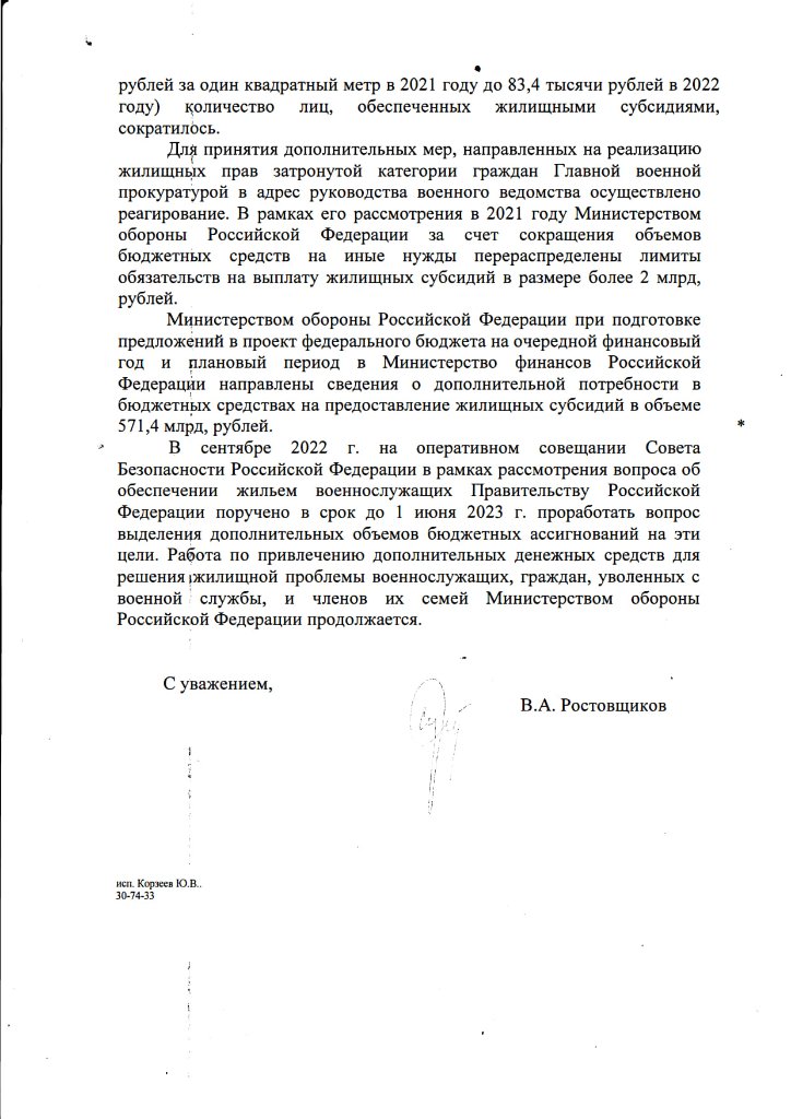 #1927Согласно информации от Уполномоченного по правам человека Волгоградской области, в сентябре 2022 г. на оперативном совещании Совета Безопасности Российской Федерации Правительству Российской Федерации поручено в срок до 1 июня 2023 г. проработать вопрос выделения дополнительных объемов бюджетных ассигнований на обеспечение жильем военнослужащих.