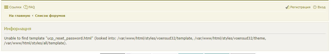 Пишет то же что и выше: Unable to find template "ucp_reset_password.html" (looked into: /var/www/html/styles/voensud32/template, /var/www/html/styles/voensud32/theme, /var/www/html/styles/all/template)." КАК ВОЙТИ В СВОЙ АККАУНТ?