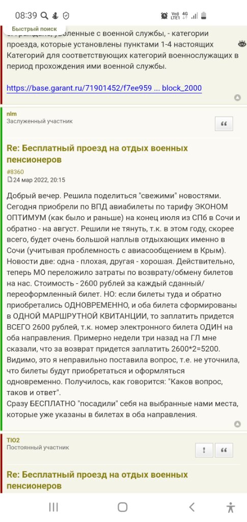 #8692Так-то оно так... Но вы здесь далеки от наших реалий. В 2020 году мне проезд "туда" ВК оплатил полностью, включая "возврат" и "выбор места". Однако, "обратно" отказал в возмещении этих опций "выбор места" и "возврат". Ибо летел другой АК, которая эти опции не включила в тариф. Обратился в суд. Сначала в мировой, потом апелляция в районный и кассационный после отрицательного для меня результата. Везде отлуп. Ни в одном судебном постановлении нет даже упоминания приказа 300. Основаниями для такого вердикта суды посчитали Приказа Минтранса и Воздушный Кодекс, разъяснения Департамента соцгарантий МО, которые к спору имеют лишь косвенное отношение. От отчаяния обратился в ВС, хотя после внесения изменений в ГПК ВС уже не рассматривает кассации при отказе трёх нижестоящих инстанций.Интересно наблюдать за теми, на этом юридическом сайте, кто предпочитает основываться в своих рассуждениях на свою логику и на некомпетентные комментарии военкоматчиков, у которых тоже есть своя логика, но они вынуждены руководствоваться внутренними инструкциями вышестоящих начальников гарнизонов и округов, которые тоже к сожалению нашему не читают руководящие документы.