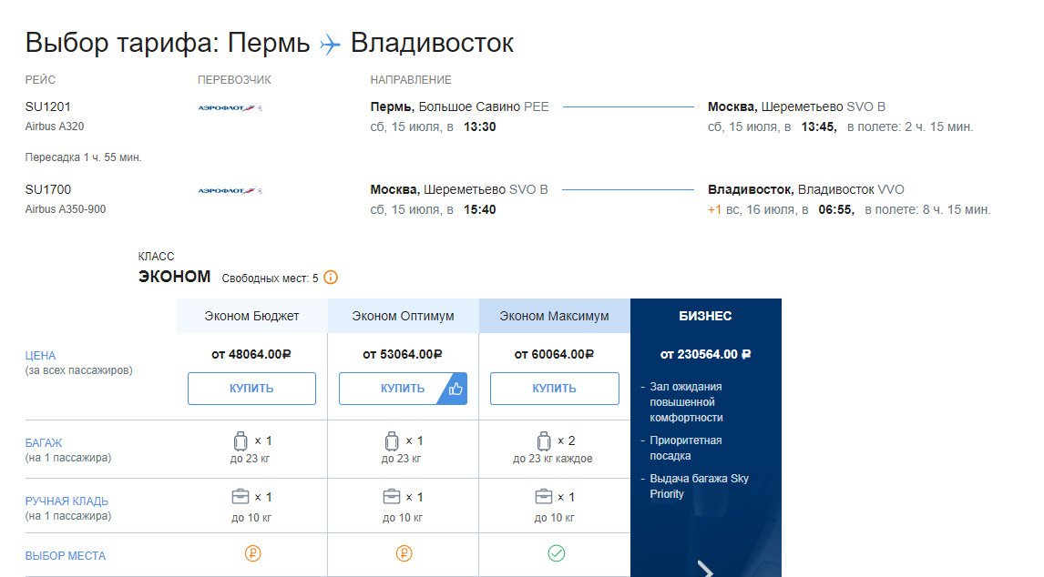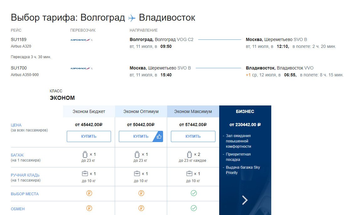 Если развернуть тариф Эконом Плюс, то там практически всё бесплатно: И где Вы нашли сейчас у а/к Аэрофлот билеты во Владик с тарифом "Эконом Максимум"?