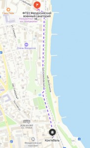 Точно такая же ситуация и в военном санатории Судак, только до ЦЕНТРАЛЬНОЙ набережной 150 м, но беда, что ведомственного пляжа нет - пляж санатория есть, но в отличие от Феодосийского туда может каждый зайти, только лежак не получит - они по санаторным книжкам.