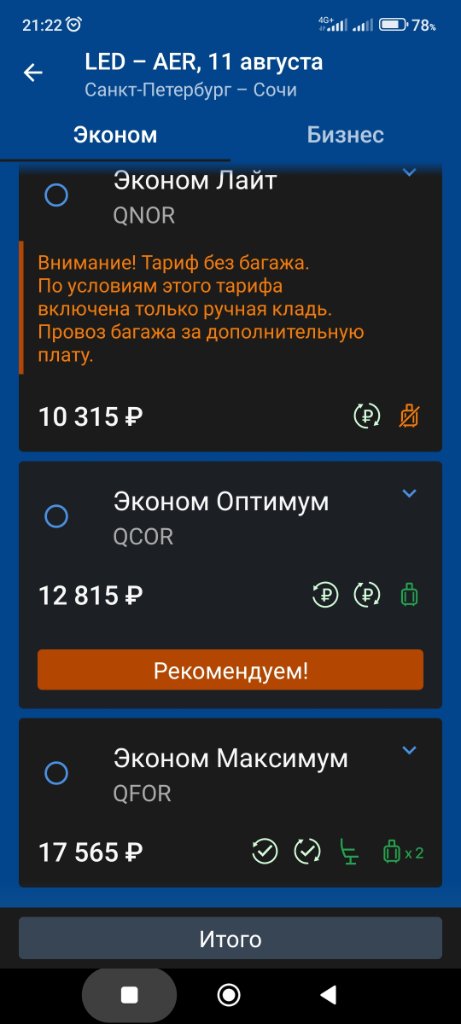 Сегодня решила проверить, не изменились ли выбранные за дополнительную плату места в авиабилетах из СПб в Сочи на середину августа и обратно на начало сентября (билеты приобретала по ВПД с дополнительной оплатой опции выбора места). ПОКА не изменились. Но обнаружила, что билетов ни по тарифу ЭКОНОМ ОПТИМУМ, ни по тарифу ЭКОНОМ МАКСИМУМ на те же даты вылета, на которые я покупала билеты, НЕТ. Есть только ПРОСТОЙ ОПТИМУМ, т.е. БЕЗ БАГАЖА и БИЗНЕС. Поэтому решила эту информацию выложить для тех, кто еще билеты на август-начало сентября не приобрел. Эта информация на прямые рейсы по авиаперевозчику Аэрофлот.