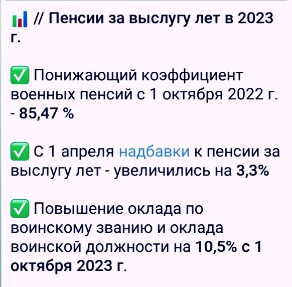 Кроме того, каждый год, если будет соответствующее решение правительства, денежное довольствие военнослужащих, а значит и военные пенсии, проиндексируют.