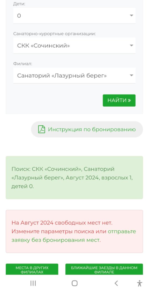 В 03.40 у меня сайт заработал. Стала заполнять заявку на август в Аврору в 2-х местный однокомнатный. Нажала на отправить и через короткий промежуток времени получила ответ, что такого номера уже нет. Стала бронировать в смежный номер - все повторилось., а после этого на август уже вообще ничего не было. Забронировали в итоге на август в Лазурный берег в 2-х местный однокомнатный. И практически сразу в оба санатория вообще исчезли номера на летние месяцы.