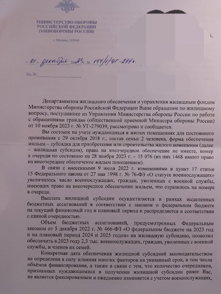 Читайте выше письмо, которое я выложил. В 2024 году планируют обеспечить 2 тыс. чел. жилищной субсидией. В этом году было обеспечено 2,3 тыс.чел.