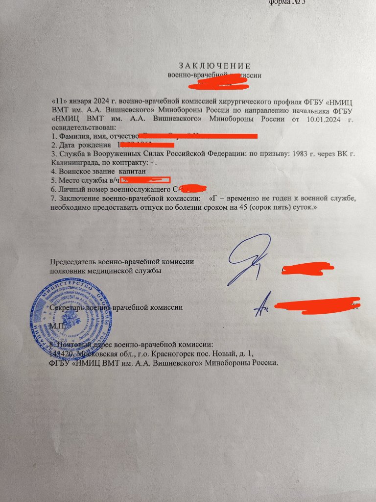 Командованию муж явно уже не интересен. Дали направление на ВВК, по месту жительства (в Вишневского, где и оперировались), так как в Ростовской области пройти ВВК нереально, муж нетранспортабелен, тем более начали проходить химиотерапию в Москве в 62 больнице.