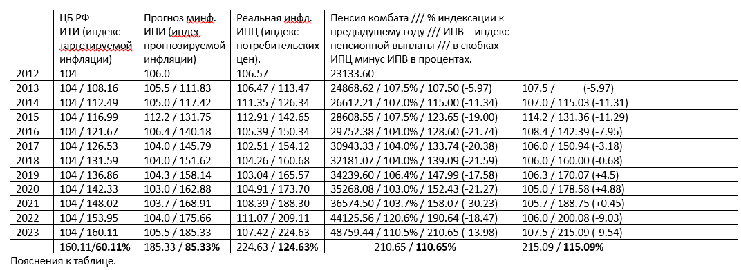 Четвёртый столбец. Максимальный размер пенсии комбата по годам. (С 1 января или с 1 октября, не имеет значения – прислушался к мнению Пахана, хотя с ним не согласен). Далее, за дробью, процент ИПВ (индекс пенсионных выплат), или процент увеличения пенсии по отношению к предыдущему году (7.5% - это ИПВ - 107.5%, 7% - это ИПВ - 107.0% и т.д.). Далее, за дробью, ИПВ за период с 2012 года. Считал ИПВ как ИПЦ. Далее, в скобках, разница между ИПЦ (индекс потребительских цен) и ИПВ (индекс пенсионных выплат) за период с 2012 года (на сколько процентов пенсия отставала от официальной инфляции).