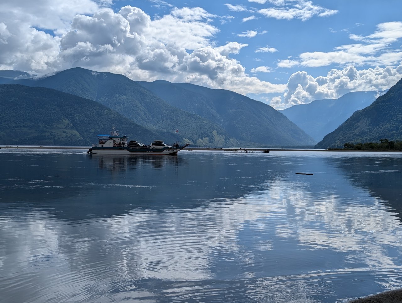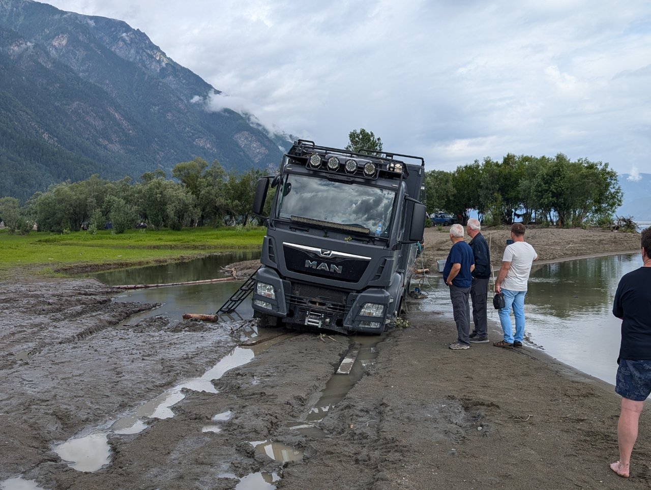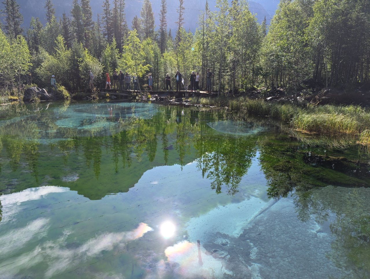 По той причине, что вода в реке, как и в озере холодная, сделали там надувной бассейн, в котором можно купаться.