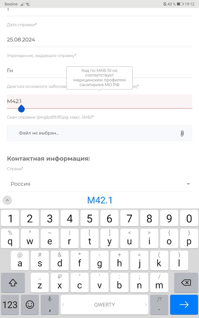 Мы говорим о разном. У вас заполнение заявки. А мы говорим о Подборе санаторно-курортных организаций по коду МКБ. У Вас на скрине сверху зеленая кнопка Проверь СКО на соответствие коду МКБ. Может путевок нет, поэтому заявка дает сбой, может еще что. Отправьте эл.письмом на почту санатория.