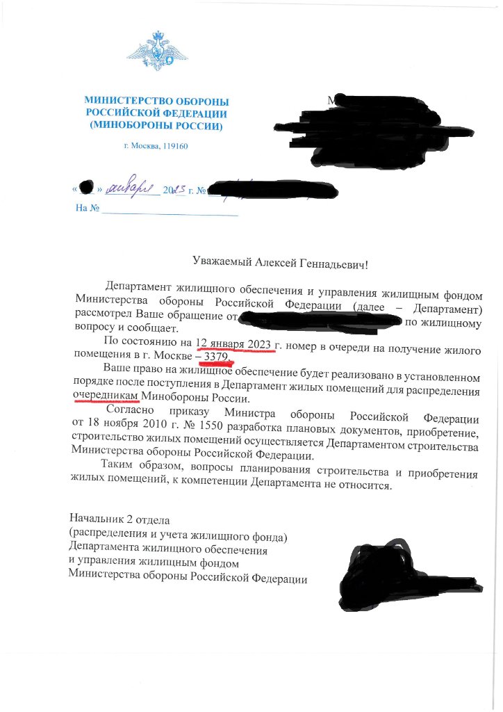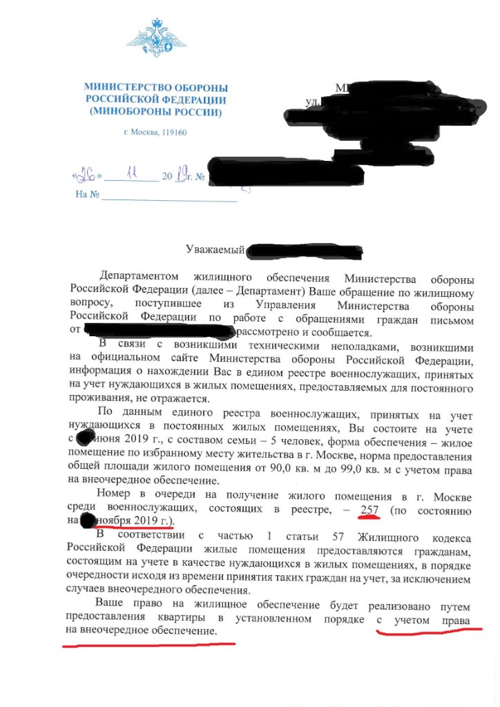 #64922pav66 видимо вам в своё время не надо было отказываться от квартиры ?Спасибо. Посмотрел... Дата принятия на учет 06.09.2016 г. Состав семьи 4 человека. Сейчас остался один. Дети решили не ждать, а строить свою жизнь, не надеясь на государство (и не веря ему). По новому учету оказался 1604-м .... Твою мать!!! Жизнь положена служению Отечеству, которое радо обобрать и пустить по-миру? Мне, в 58 лет брать ипотеку и строить жизнь по новому?!На сайте минобороны по личному номеру теперь можно увидеть номер в очереди.