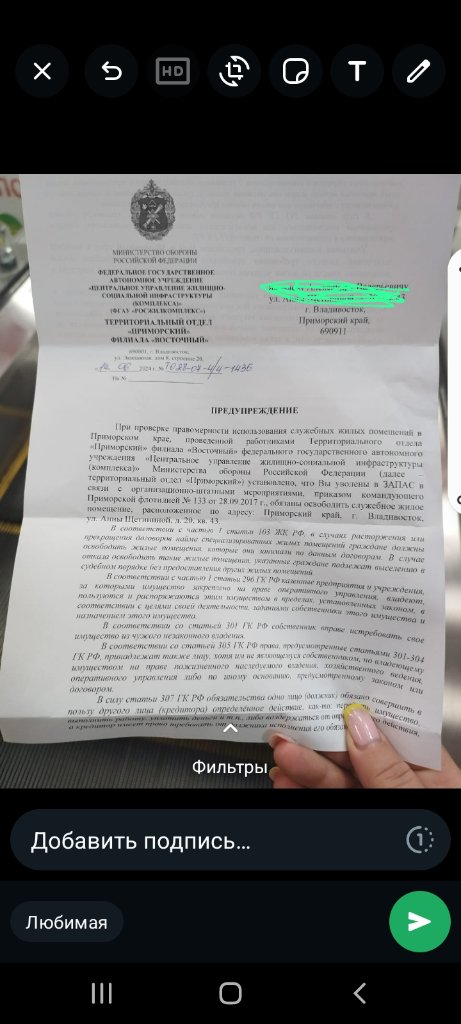 #4995Александр 14021983 выкладывайте обезличенное письмо, интересно почитать, какими НПА они определили не законность проживания..., и кто прислал это письмо.Добрый день подскажите ситуация такова уволен по ошм в 2017 году.В том же году признан нуждающимся в постоянном жилье.Живу все это время в служебной квартире.в 2024 пришло письмо что я проживаю в данной служебной квартире незаконно и мне нужно выселиться из нее со всей семьей.Как быть .Постоянное жилье не получил.