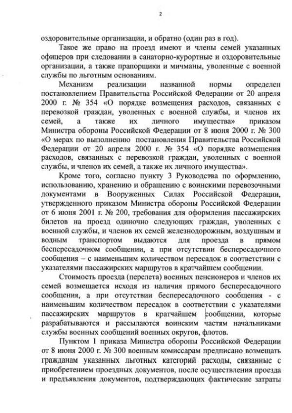 С учетом изложенного, при совпадении маршрута проезда (перелета) в кратчайшем сообщении, установленного службой военных сообщений, с маршрутом проезда конкретного военного пенсионера и членов его семьи (близких родственников) от места санаторно-курортного лечения к месту их жительства и обратно, стоимость их проезда (перелета) подлежит возмещению.
