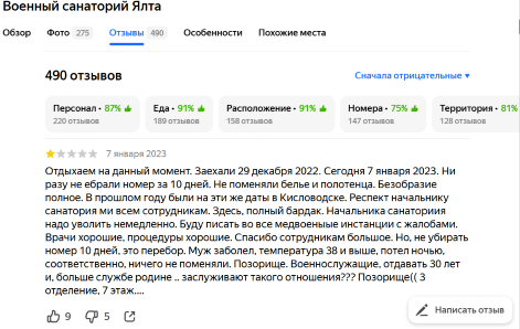 неоднократно отдыхал в городе Ялта и в декабре и январе, в санатории «Ялта» - в мае-июне. Очень люблю этот город и одноимённый санаторий. Буду ездить и в город и в санаторий, пока будет получаться это делать. Из своего опыта – Ялта прекрасна всегда, и летом и зимой. Но… и на Солнце бывают пятна, а в космосе – пыль. Иногда какой-нибудь, казалось бы, пустяк – дождливая погода, смена воды в бассейне, отсутствие уборки в номере, сломанный душ, шумные соседи, внезапно подхваченный насморк и др., может «отравить» человеку отдых. Хорошо, если человек умеет относиться в жизни к невзгодам некоторого уровня по-философски и не относится к этому слишком серьёзно (как в приложенном ниже отзыве).