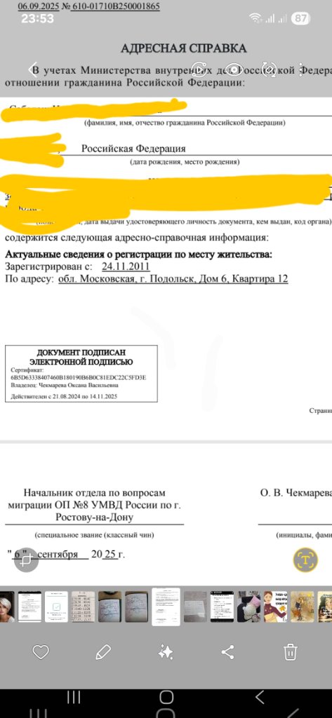 #65279Здравствуйте, да, первая выписка на Госуслуги пришла, с пропиской г.Подольска д.6 даже без улицы. Поехала в МВД по прописке. Там, после разборок, поставили штамп с правильной пропиской, на вопрос, как такое могло случиться, пожали плечами. Сказали все исправят. Заказала новую справку, и она пришла уже с правильной пропиской, вроде, как и не была больше нигде прописана.