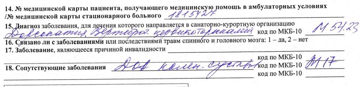 В строке "Диагноз заболевания, для лечения которого направляется в санаторно-курортную организацию" указывается наименование диагноза заболевания с кодом по МКБ, для лечения которого направляется в санаторно-курортную организацию в соответствии с Перечнем медицинских показаний и противопоказаний для санаторно-курортного лечения и медицинской реабилитации...