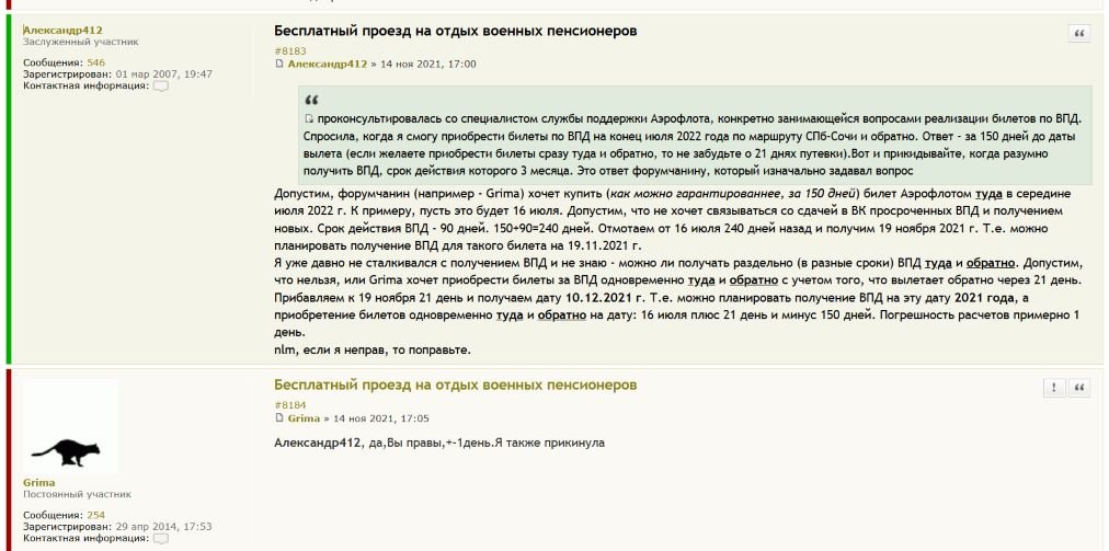 #25813Когда-то на форуме уже обсуждались вопросы самого раннего приобретения билетов Аэрофлота для поездки в санаторий и обратно и самого раннего получения ВПД под эти билеты. Если интересно:Наоборот. Выдача воинских перевозочных документов осуществляется на срок три месяца. По истечении 3-х месячного срока документы становятся недействительнымиДоброе время суток! В военкомате мне пояснили, что ВПД можно выписывать за 150 суток до отъезда, но купить билеты нужно в течение трёх месяцев со дня выписки ВПД.