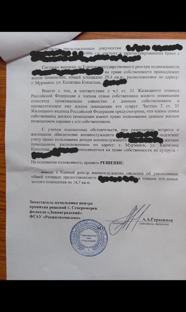 #65499Интересно почитать на какие НПА они ссылаются. Если дочь как вы пишите зарегистрирована и проживает совместно с вами. Или вы, что то не договариваете...Ехать не пришлось, пришло решение о выплате. В нём сказано, что они решили вычесть из суммы субсидии, стоимость половины площади квартиры зятя. Объясняют это тем, что она имеет право пользоваться его квартирой, купленной задолго до брака.voblermak, и какие результаты вашей поездки... ?