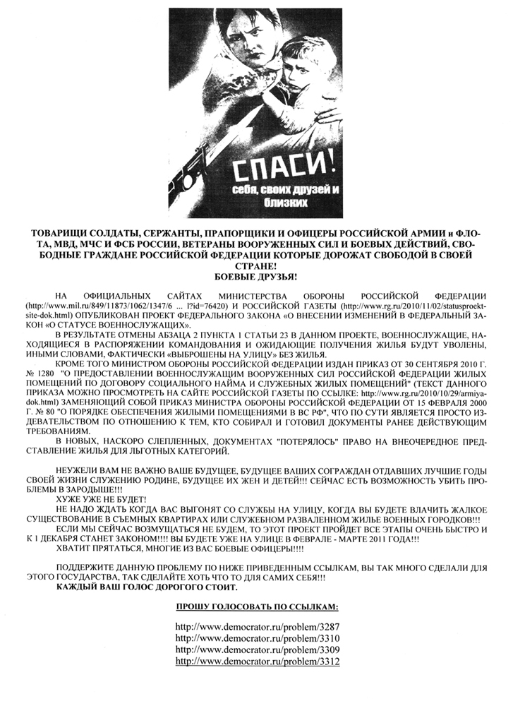 "Поддерживаю! А голосов уже были бы десятки тысяч, если бы в тех районах, где служат офицеры, был интернет. Там не то, что интернета, жилья никакого нет, знаю не понаслышке. Тошно смотреть на происходящее понимая- какое отношение государства к армии, такое же и к народу." - это один из коментариев на демократоре.ру, и действительно интернет имеют всего лишь процентов 20 военнослужащих, так что идею с листовками поддерживаю полностью, готов даже печатать, штук 200-250 смогу правда черно-белые.