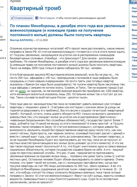 В силу специфики своей "подработки" и лично-професионального интереса регулярно приношу на службу распечатки и пытаюсь разъяснить истинную суть подобных документов: циничные извороты в толковании высших судебных инстанций в том числе и Конституционного Суда, упорное выхолащивание закона "О статусе военнослужащих", особенно что касается жилищных прав, и др. моменты "заботы" государства о своих гражданах, не только военнослужащих. И, знаете, интереса, а тем более поддержки в оценке таких документов практически ноль. Интерес и поддержка начинает проявляться только кода, пусть и отдельные товарищи, начинают обращаться за помощью в решении личной проблемы возникшей на основании подобных документов. Такая вот у нас гражданская активность военнослужащих в участии в делах государства!?