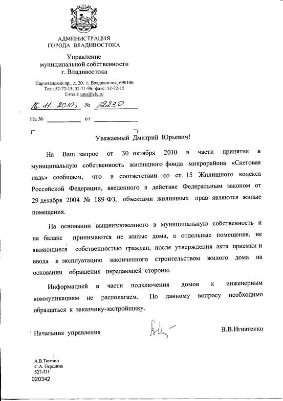 Всем добрый день. В конце октября я написал в интернет-приемную администрации города вопрос. Спрашивал когда нашу СП подключат к городским комуникациям и когда СП примет город. Вот ответ!!!