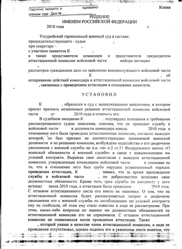 10. Аттестационные выводы и порядок проведения аттестации могут быть обжалованы военнослужащим вышестоящему командиру (начальнику) в течение месяца со дня объявления ему результатов аттестации, а также в суд.