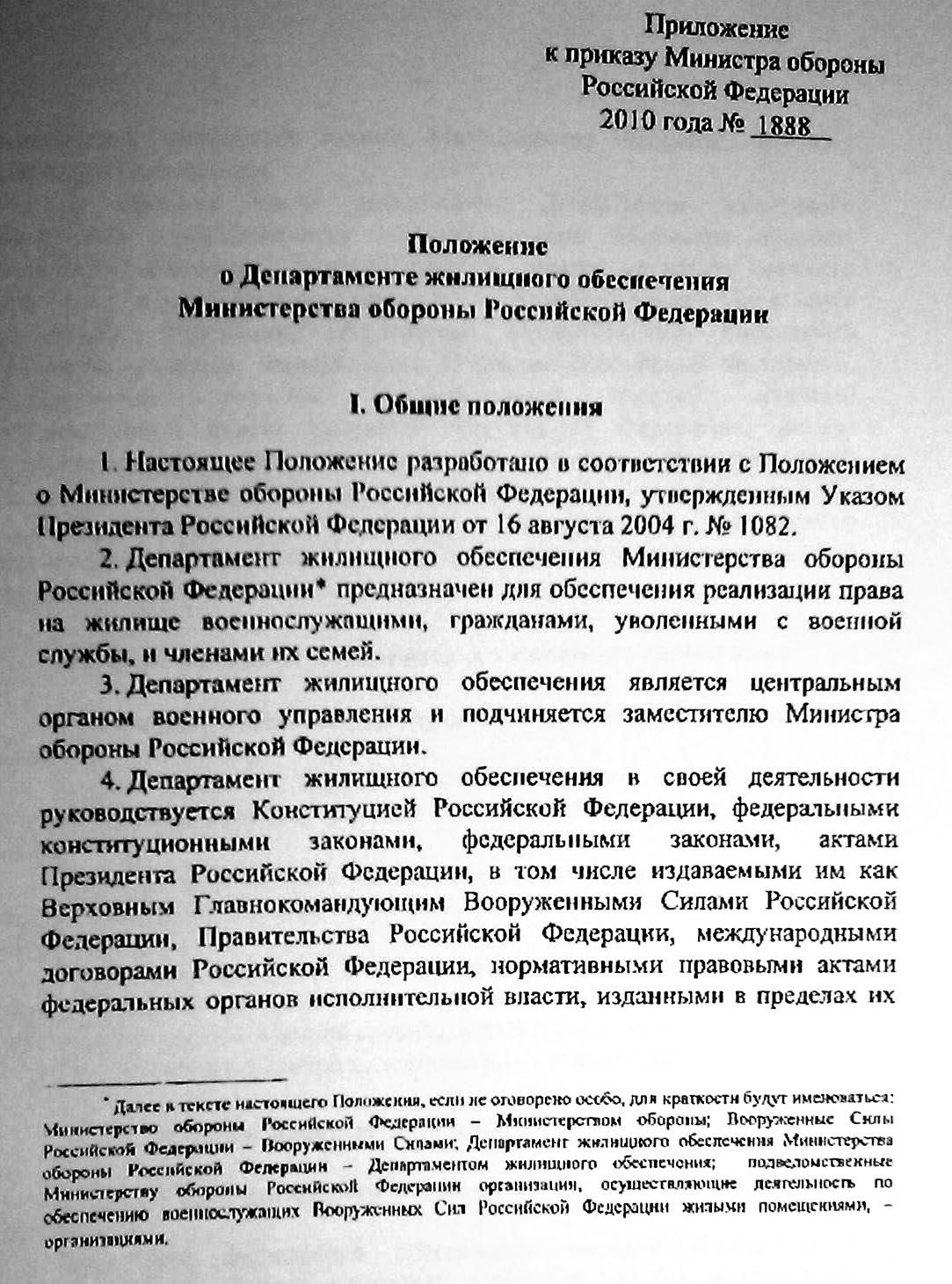 "Департамент жилищного обеспечения является центральным органом военного управления и подчиняется заместителю Министра оброны Российской Федерации."