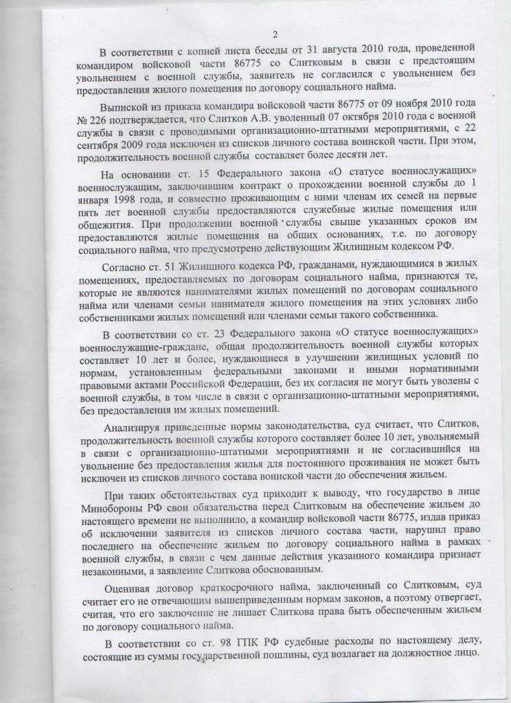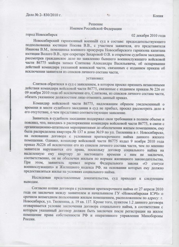Решил, что выложу свои решения судов здесь. Пришло и мое время быть уволенным. Считаю свое увольнение незаконным. За пределом, по ОШМ, жилье по месту службы по норме, уволен, но по ИПМЖ не обеспечен. Отсудился в суде первой и второй инстанции - отказ в удовлетворении. Всё крутилось вокруг служебности-неслужебности жилья и открытия военного городка, особенно старались все - ответчик-командир, местная КЭЧ и сам судья первой инстанции. На оригинальность своего случая не претендую, но может кому что-то пригодится, поэтому решил выложить