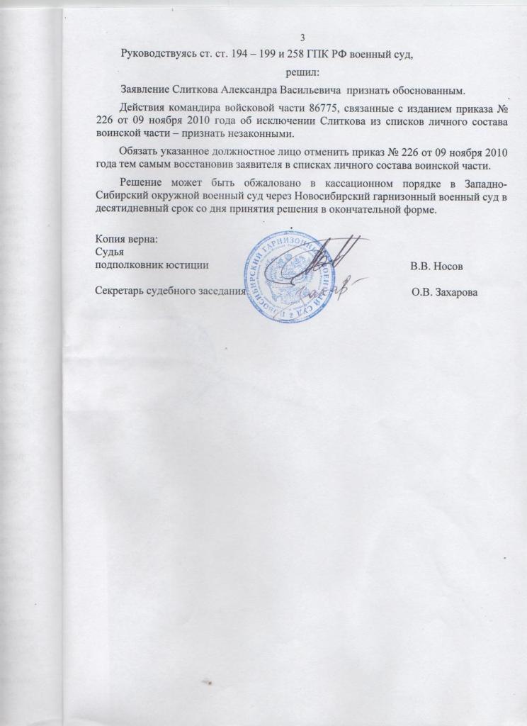 Решение может быть обжаловано в кассационном порядке в Ленинградский окружной военный суд через Великоновгородский гарнизонный военный суд в течение десяти дней со дня его принятия.