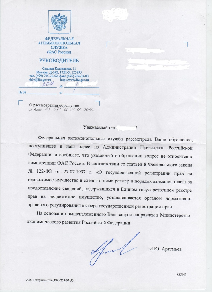 Да и вообще не понятно, как ФАС такое может отвечать, если в N 59-ФЗ "О порядке рассмотрения обращений граждан Российской Федерации" говорится,
